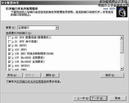 進(jìn)入“網(wǎng)絡(luò)安全”對(duì)話框,在此可配置已經(jīng)選中的服務(wù)器角色和其他Windows 2003服務(wù)所使用的端口。點(diǎn)擊“下一步”按鈕后,在“打開端口并允許應(yīng)用程序”對(duì)話框中開放需要的端口(圖2)。如FTP服務(wù)器需要的“20和21”端口,IIS服務(wù)需要的“80”端口等。只要在列表框中選擇要開放的端口選項(xiàng)即可,最后確認(rèn)端口配置。