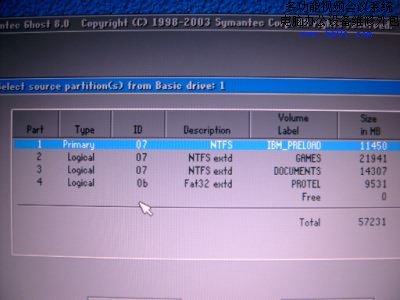 系統(tǒng)備份:從光盤啟動(dòng)進(jìn)入DOS環(huán)境,由于C、D、E分區(qū)都為NTFS格式在DOS下不能顯示,此時(shí)的C 盤就是當(dāng)初的FAT32格式的F盤了。運(yùn)行其中的Ghost.exe,選擇Local----Partition----To Image(分區(qū)到鏡像文件的備份)。在GHOST里所有格式的分區(qū)都能看到,首先選擇需要備份的硬盤(如果有其他硬盤的話,加以選擇)。然后選擇需要備份的系統(tǒng)主分區(qū),在此我們選擇卷標(biāo)為 IBM_PRELOAD的1號(hào)分區(qū),如下圖: