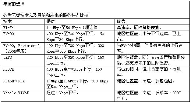 以前,當(dāng)某位員工要出差時(shí),公司只要給他一部蜂窩手機(jī)和一臺(tái)用于撥號(hào)接入數(shù)據(jù)網(wǎng)絡(luò)的筆記本電腦即可。但是,這種日子已經(jīng)一去不復(fù)返了。今天的無線市場中充滿了各種新興的選擇,并且無論從功能還是特性方面都有很大的提升。雖然所有這些主要技術(shù)都支持無線通信,但用戶需要考慮并做出決定的東西也更多,如設(shè)備、運(yùn)營商、性能和覆蓋范圍等。