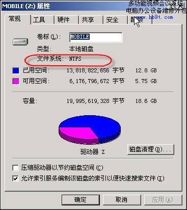 NTFS的英文全稱為“NT File System”,中文意為NT文件系統(tǒng)(見圖1 24rntfs01 在“我的電腦”中右擊“屬性”,在彈出窗口中就可以看到文件系統(tǒng)信息)。它隨著1996年7月的Windows NT 4.0誕生的,但直到Windows 2000,它才開始在個人用戶中間得以推廣,跨入了主力分區(qū)文件系統(tǒng)的行列。今天,Windows XP/2003和NTFS早已是“如膠似漆”了。