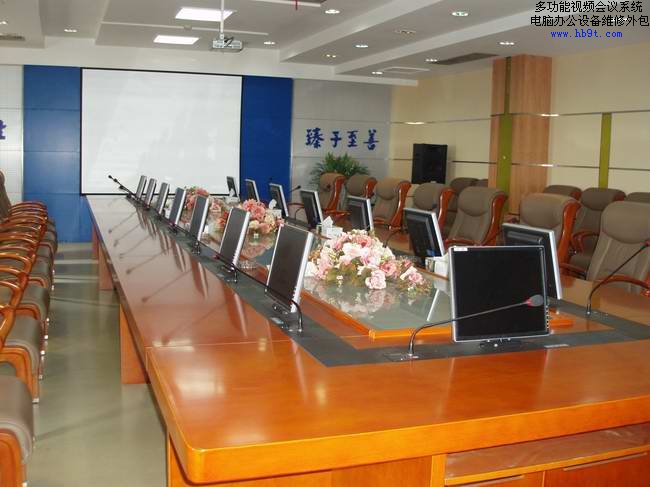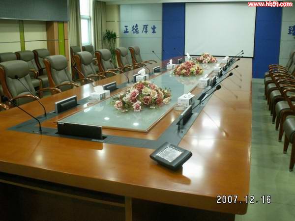 設備的分布大體是:1、每個人面前一臺可以升降的顯示器;2、每個人面前有一個鵝頸話筒;3、每個人面前有一個多功能信息插座;